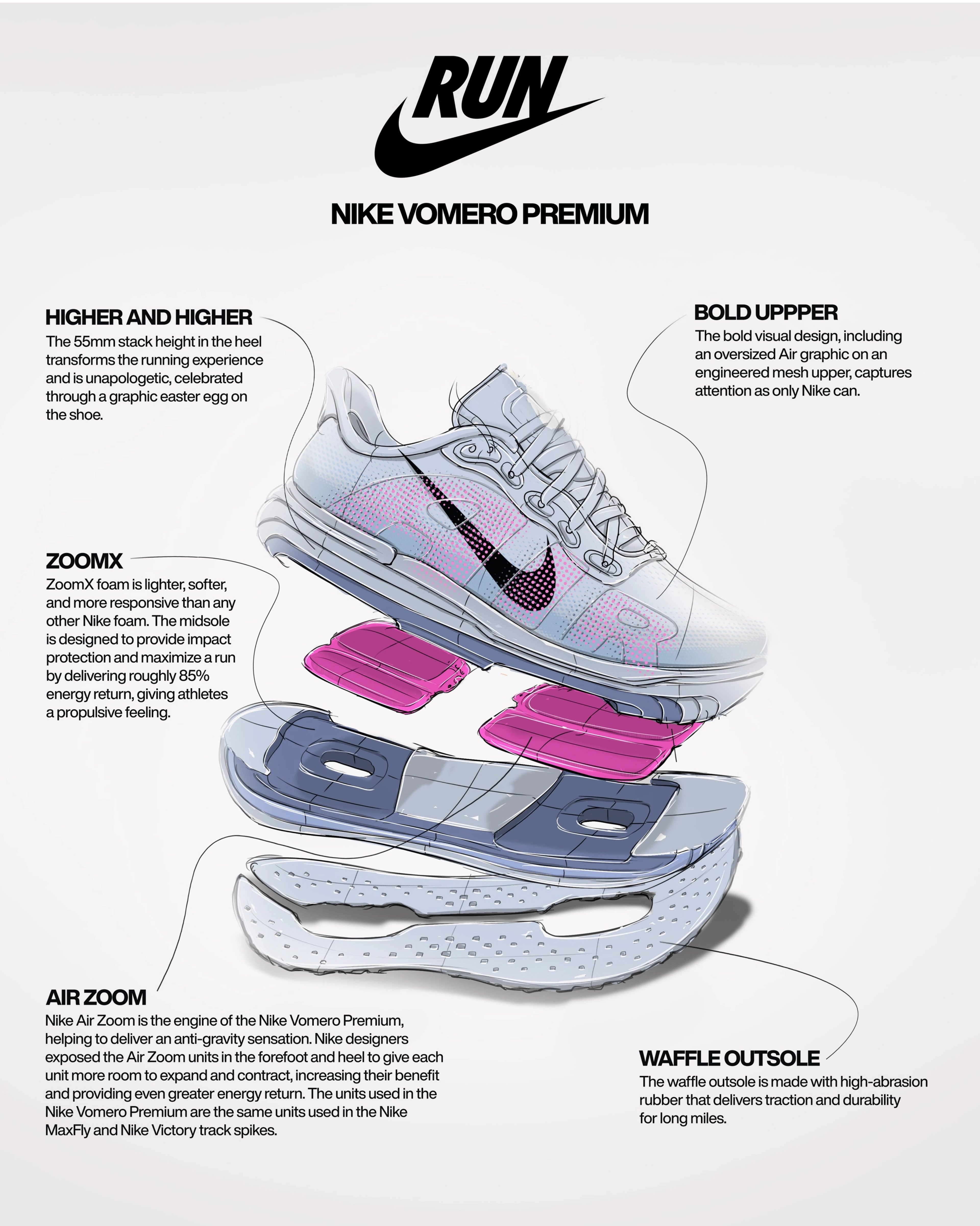 Modèle le plus poussé de la gamme d'amorti maximal des chaussures de running sur route de Nike, la Vomero Premium est conçue pour répondre aux besoins des marathoniens et marathoniennes de haut niveau, qui utilisent en général à la fois des « supershoes » et des chaussures souples pour préparer une course.