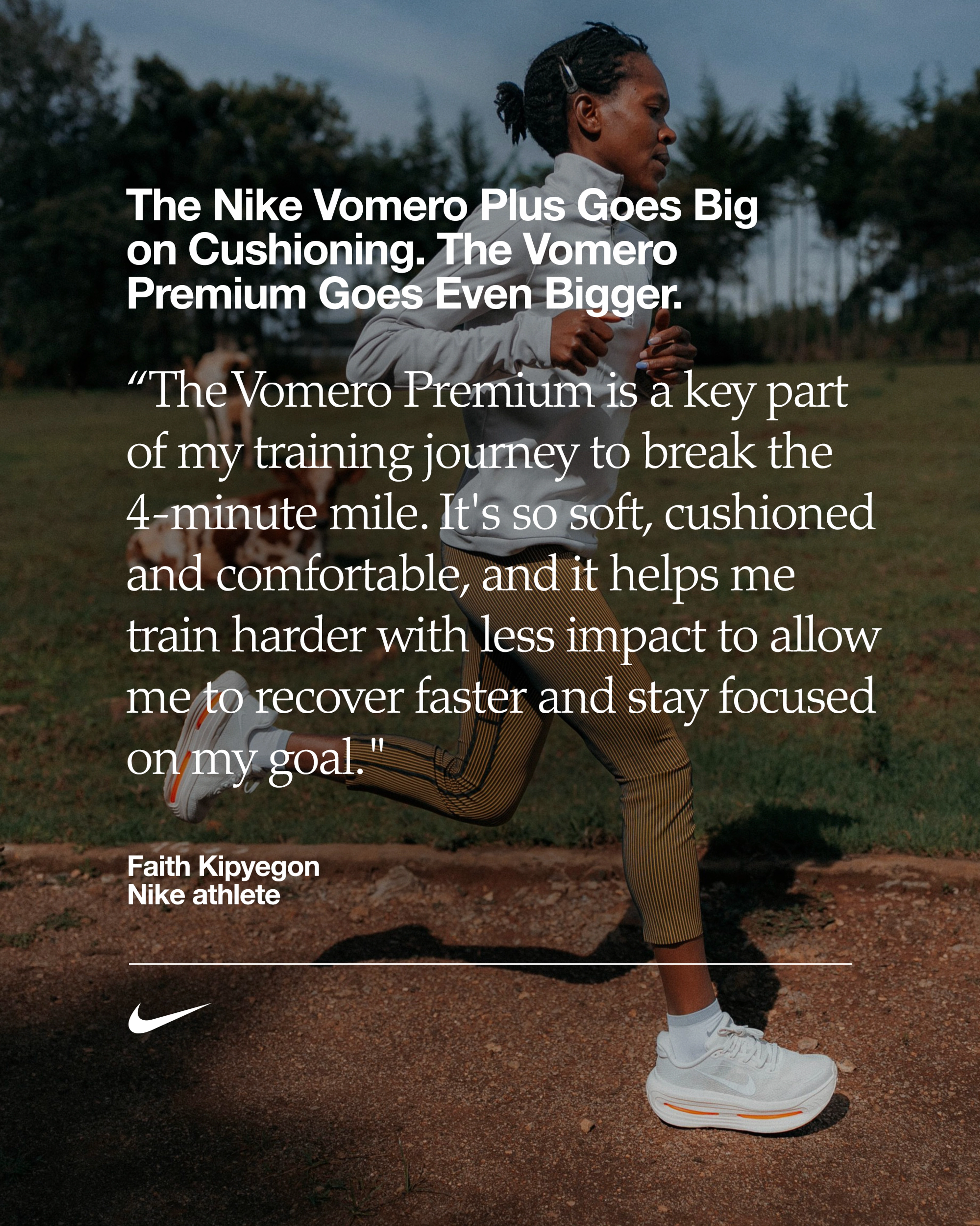 « La Vomero Premium est une composante clé de mon programme d'entraînement pour courir un mile en moins de 4 minutes, indique Faith Kipyegon. Elle est tellement souple, moelleuse et confortable... Elle me permet de m'entraîner plus dur sans subir plus d'impacts, c'est parfait pour récupérer plus vite et rester concentrée sur mon objectif. »