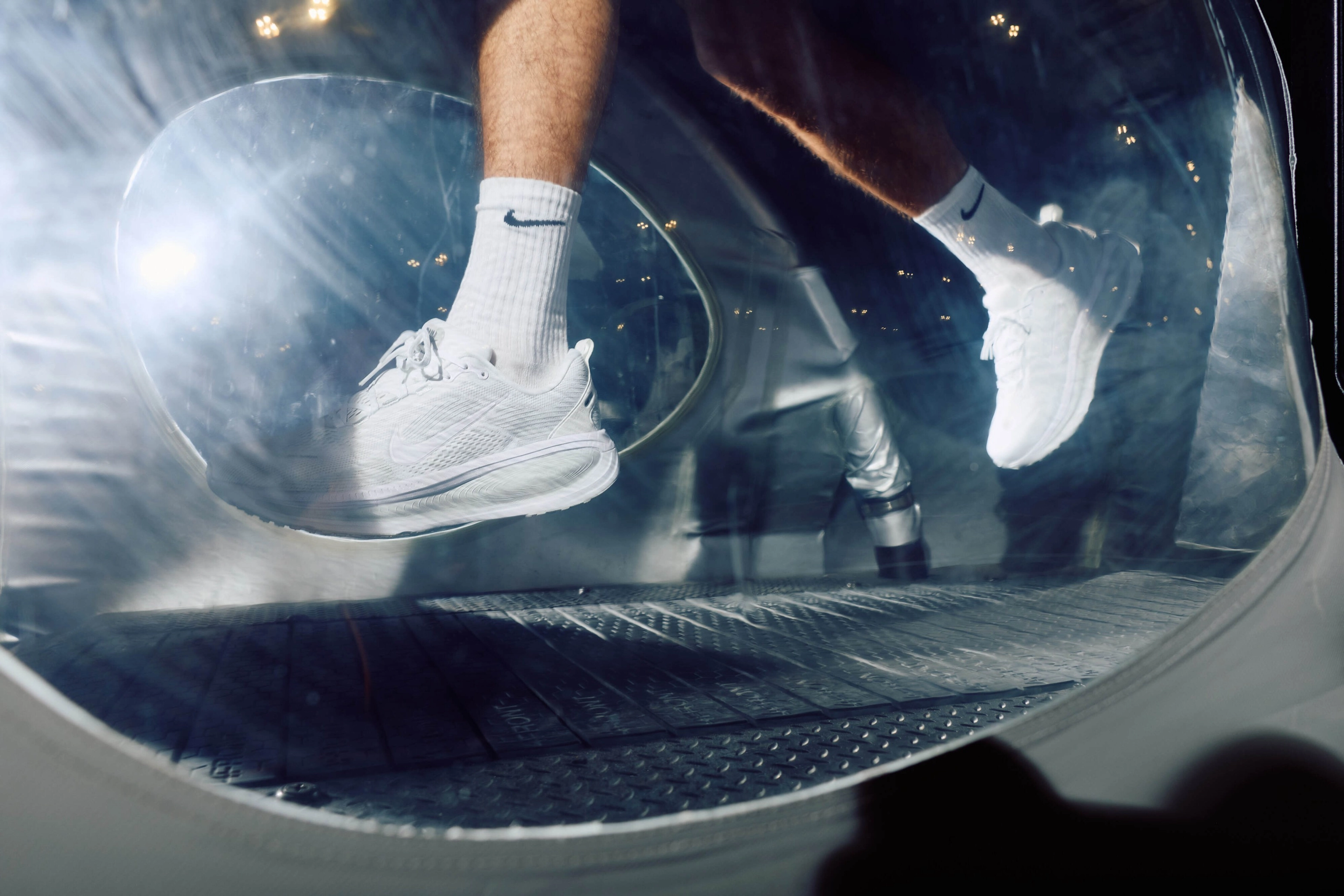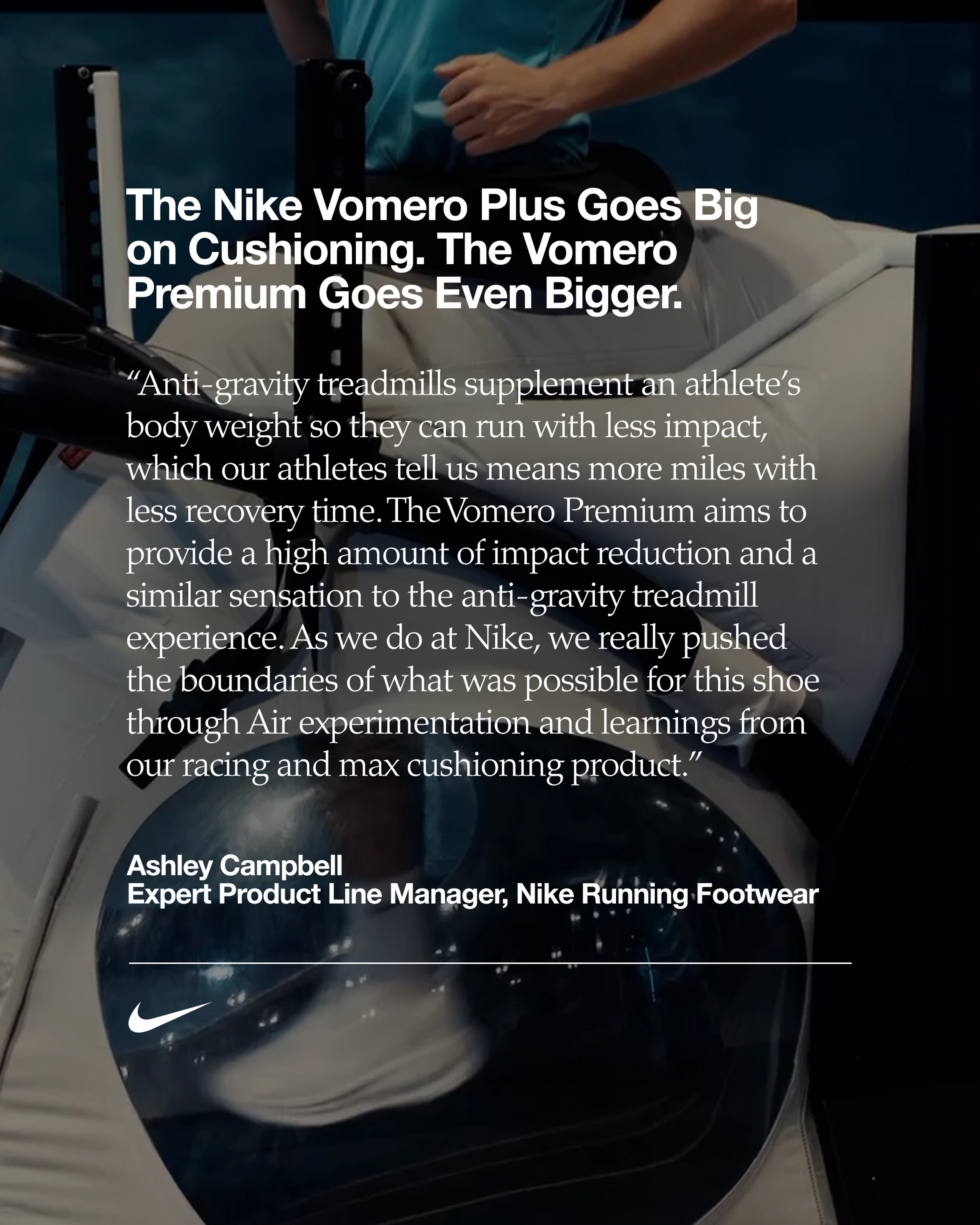 « Les tapis de course anti-gravité compensent le poids des athlètes pour limiter les impacts pendant la course. Ça leur permet de courir davantage tout en récupérant plus vite, explique Ashley Campbell, Expert Product Line Manager, Nike Running. La Vomero Premium vise à réduire considérablement les impacts et à procurer des sensations similaires à celles que l'on ressent sur un tapis de course de ce type. Comme toujours chez Nike, on a vraiment repoussé les limites du possibles pour cette chaussure, en faisant des expériences avec la technologie Air et en tirant les leçons de nos modèles de course et à amorti maximal. »