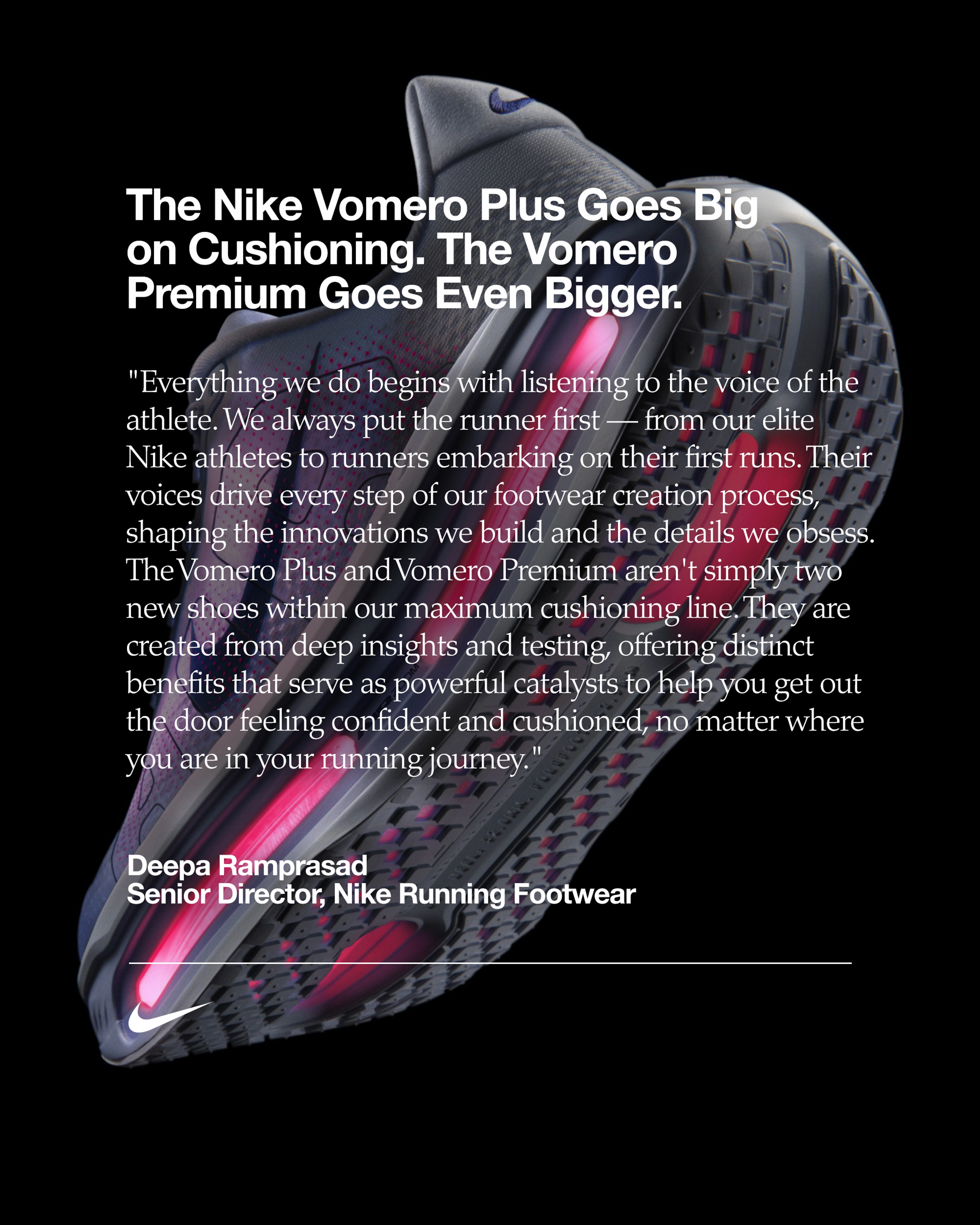 « Chaque fois qu'on se lance dans un nouveau projet, on commence par écouter les athlètes, explique Deepa Ramprasad, Senior Director, Running Footwear. La communauté running est au cœur de nos préoccupations, de nos athlètes Nike de haut niveau aux novices qui partent pour leurs premières sorties. Leurs idées orientent chaque étape du processus de création de la chaussure, elles façonnent les innovations qu'on conçoit et les détails qu'on peaufine. La Vomero Plus et la Vomero Premium ne sont pas seulement deux nouveaux modèles de notre gamme d'amorti maximal. On les a créés en s'appuyant sur des retours d'expérience et des tests poussés, en faisant en sorte qu'ils proposent des bénéfices produits spécifiques afin que chaque athlète sorte courir en ayant confiance en ses capacités et en l'amorti de la chaussure, quel que soit son niveau de running. »