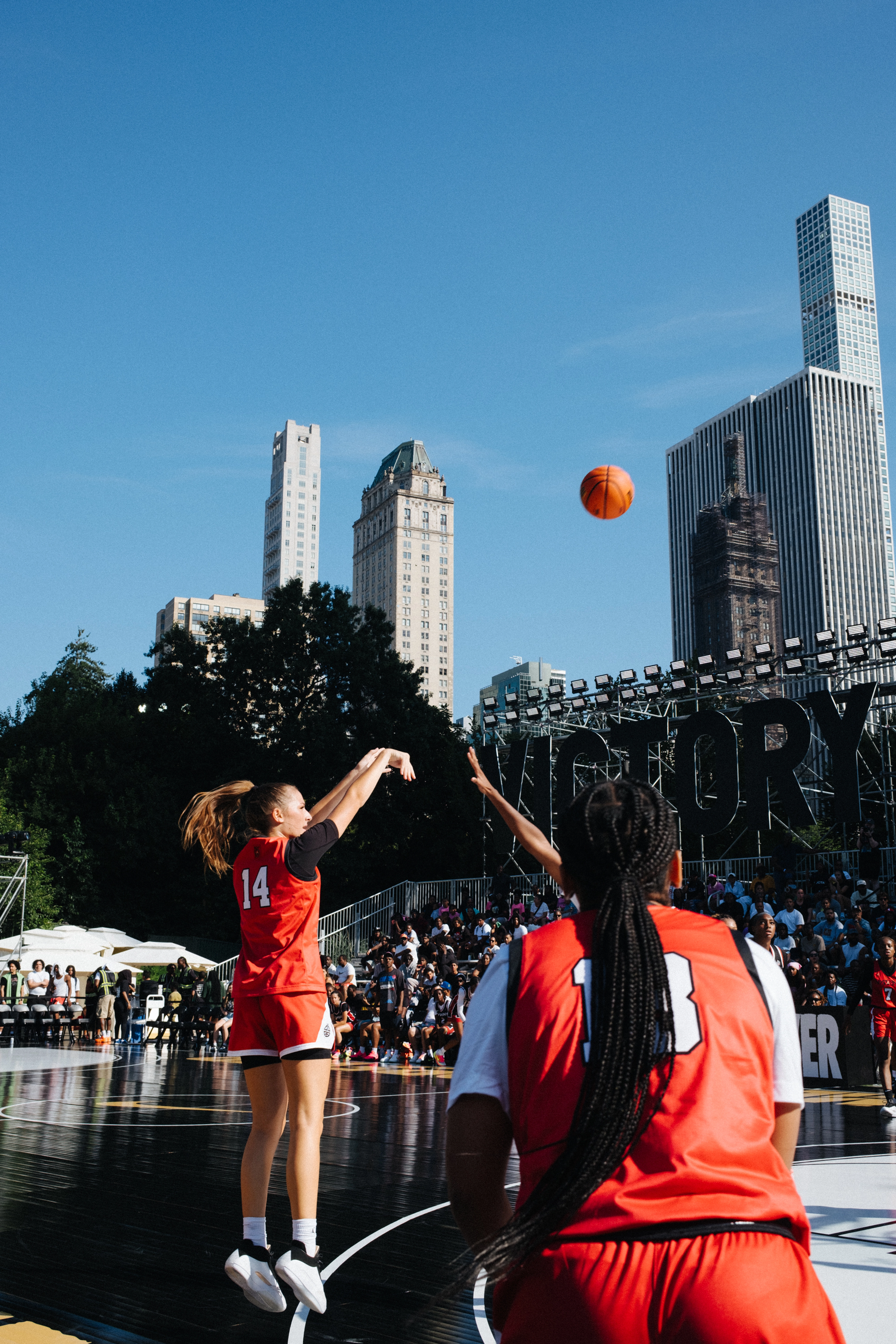 Atlee Vanesko, futura giocatrice degli Ohio State Buckeyes, in elevazione a Victory Park mentre esegue un tiro da tre perfetto con lo skyline di New York sullo sfondo.