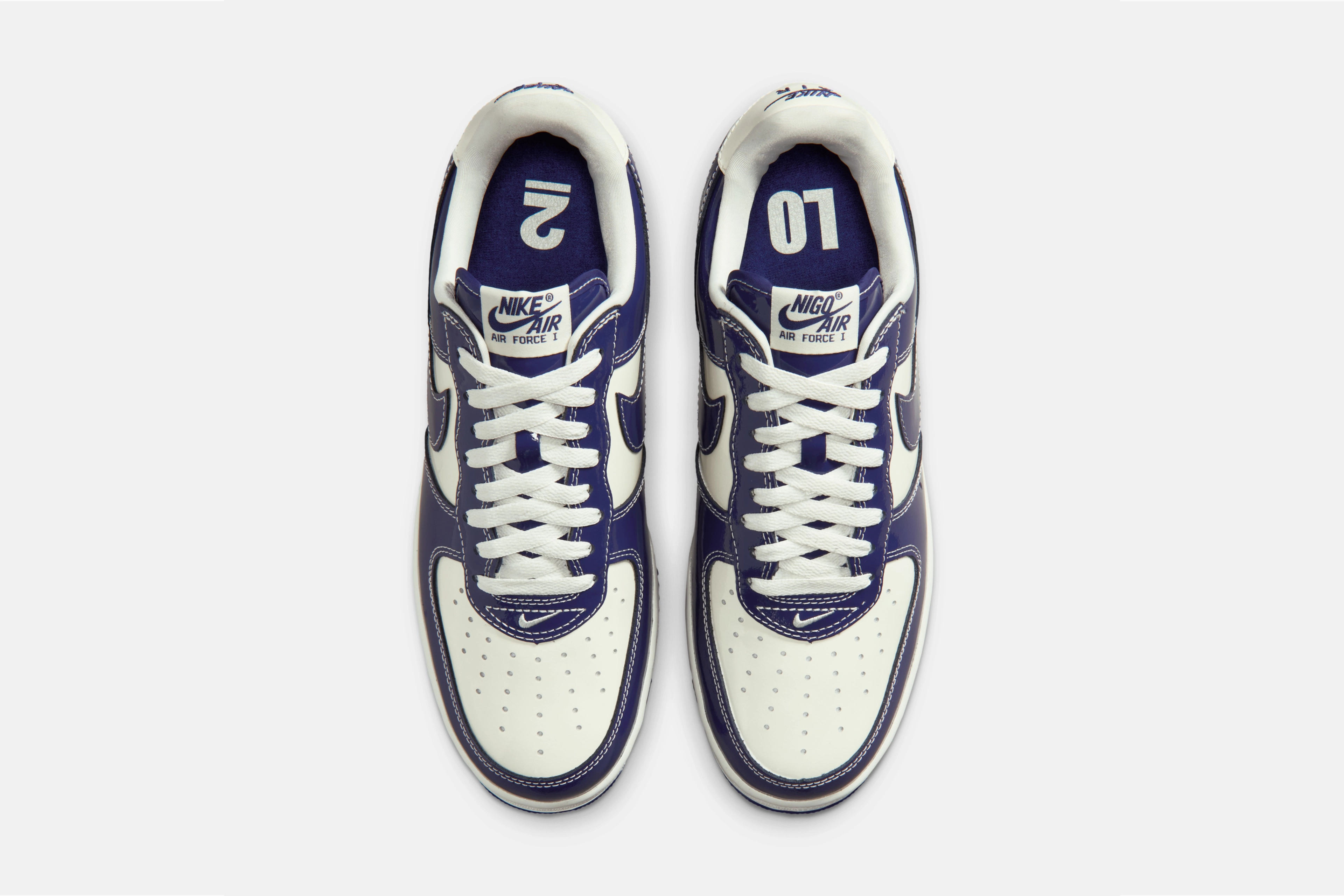 - La prima Air Force 1 di Nigo presenta il branding LO2 e Nigo Air, una tomaia in pelle verniciata, il look vintage più affusolato del modello Air Force 1 del 2001, e gli stessi colori dell'insegna della celebre boutique NOWHERE di Nigo e Jun.