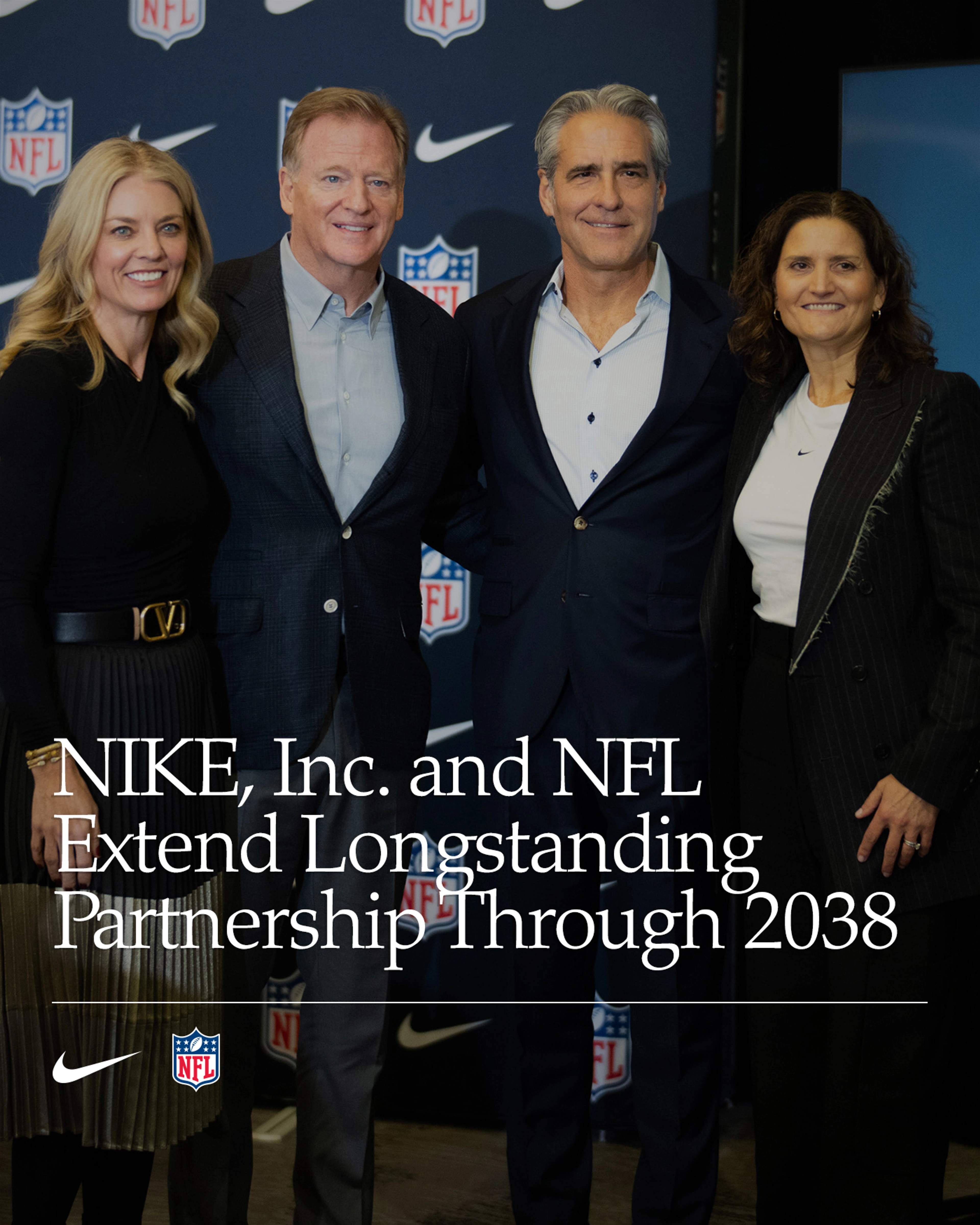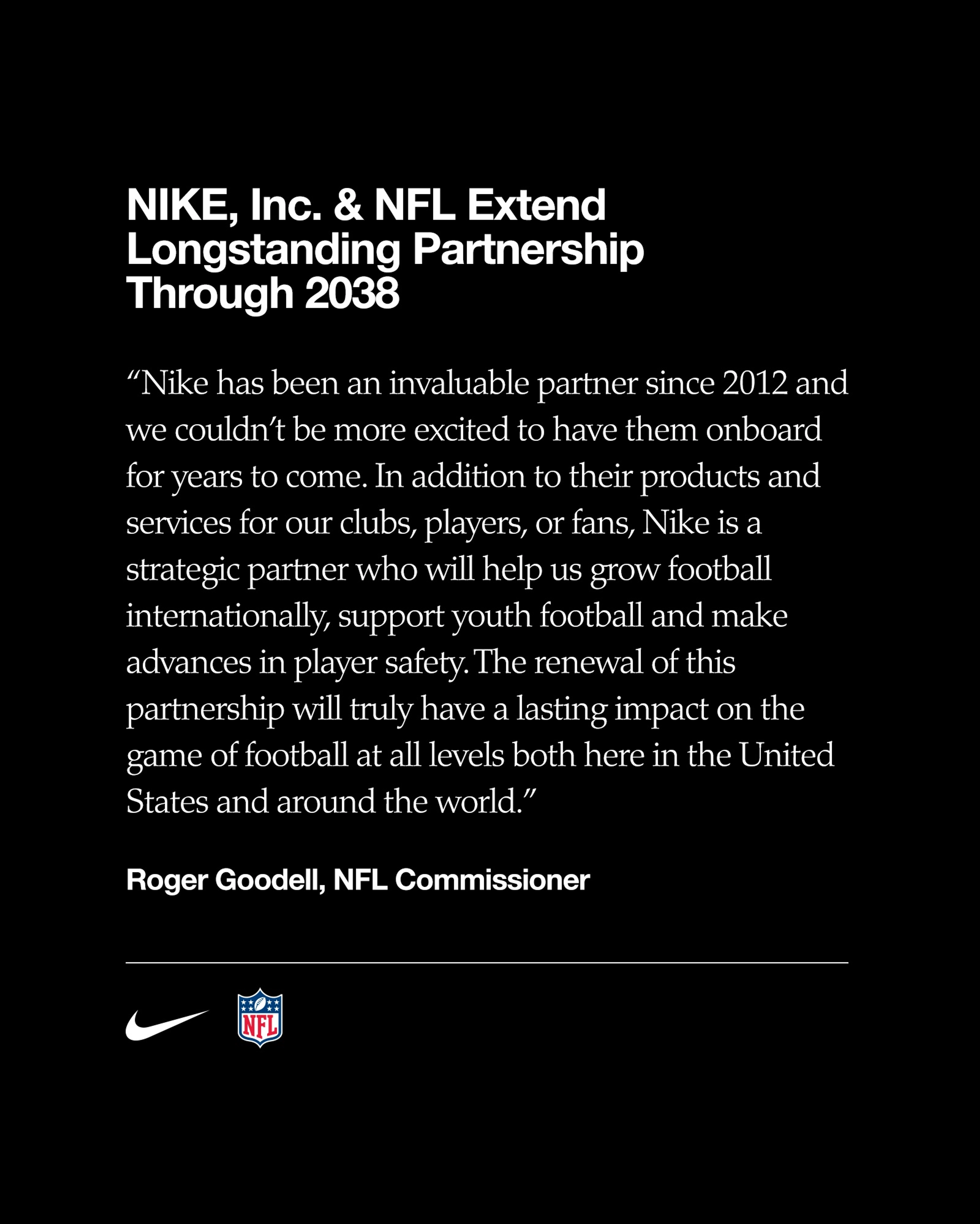 "Nike è un nostro partner inestimabile dal 2012 e non potremmo essere più entusiasti di avere questo brand al nostro fianco per gli anni a venire", ha affermato Roger Goodell, NFL Commissioner. E ha aggiunto: "Oltre a fornire prodotti e servizi a club, giocatori, giocatrici o fan della NFL, Nike è un partner strategico che ci aiuterà a far crescere il nostro sport a livello internazionale, a sostenere il football americano giovanile e a fare progressi per la sicurezza di chi lo pratica. Il rinnovo di questa partnership avrà sicuramente un impatto duraturo sul football americano a qualsiasi livello, sia negli Stati Uniti che nel resto del mondo".