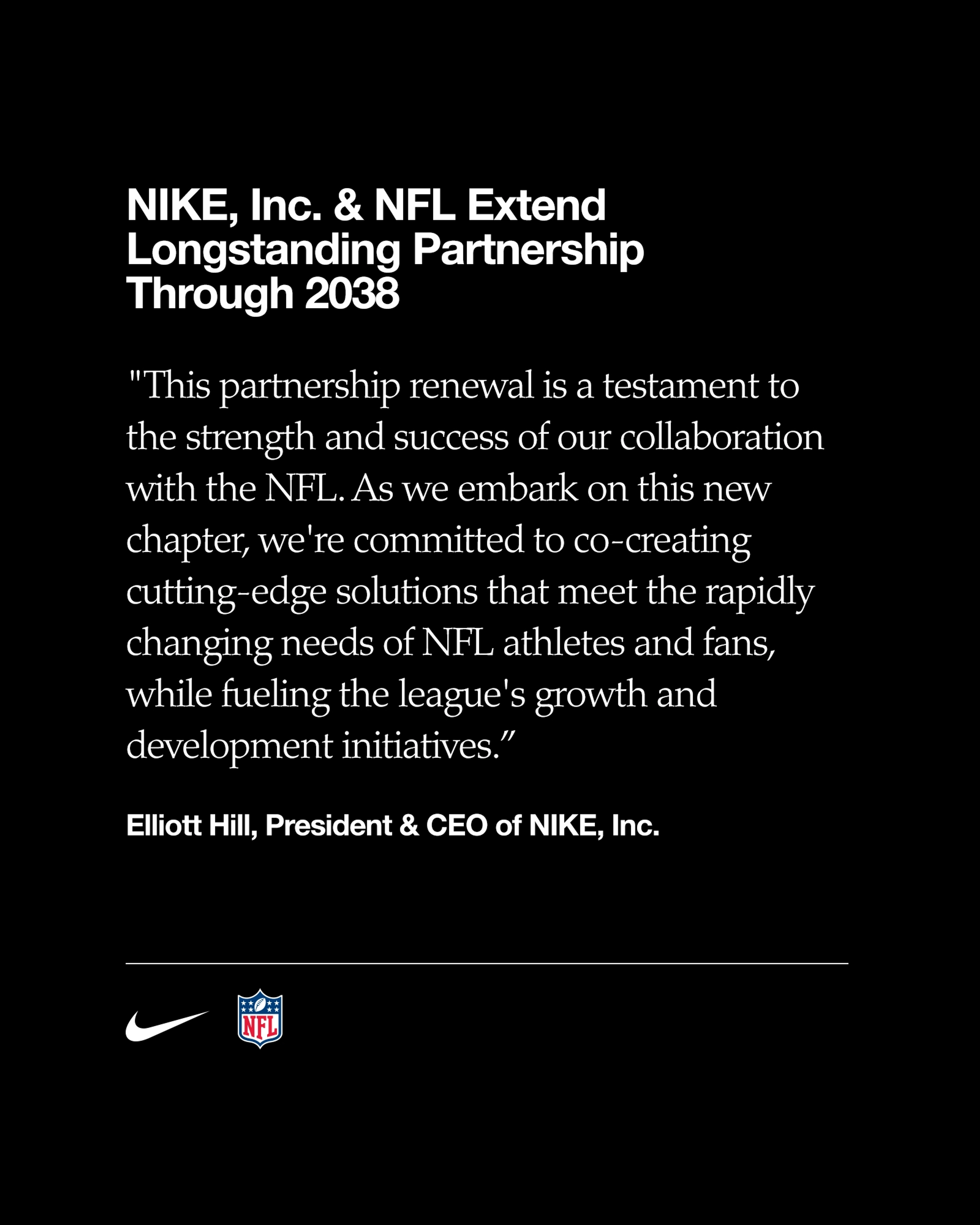 "Il rinnovo di questa partnership dimostra la solidità e il successo della nostra collaborazione con la NFL. Con questo nuovo capitolo ci impegniamo a creare insieme soluzioni all'avanguardia che rispondono alle esigenze in continua evoluzione di atleti e fan della NFL, sostenendo al tempo stesso le iniziative di crescita e sviluppo della lega", ha dichiarato Elliott Hill, President & CEO di NIKE, Inc.