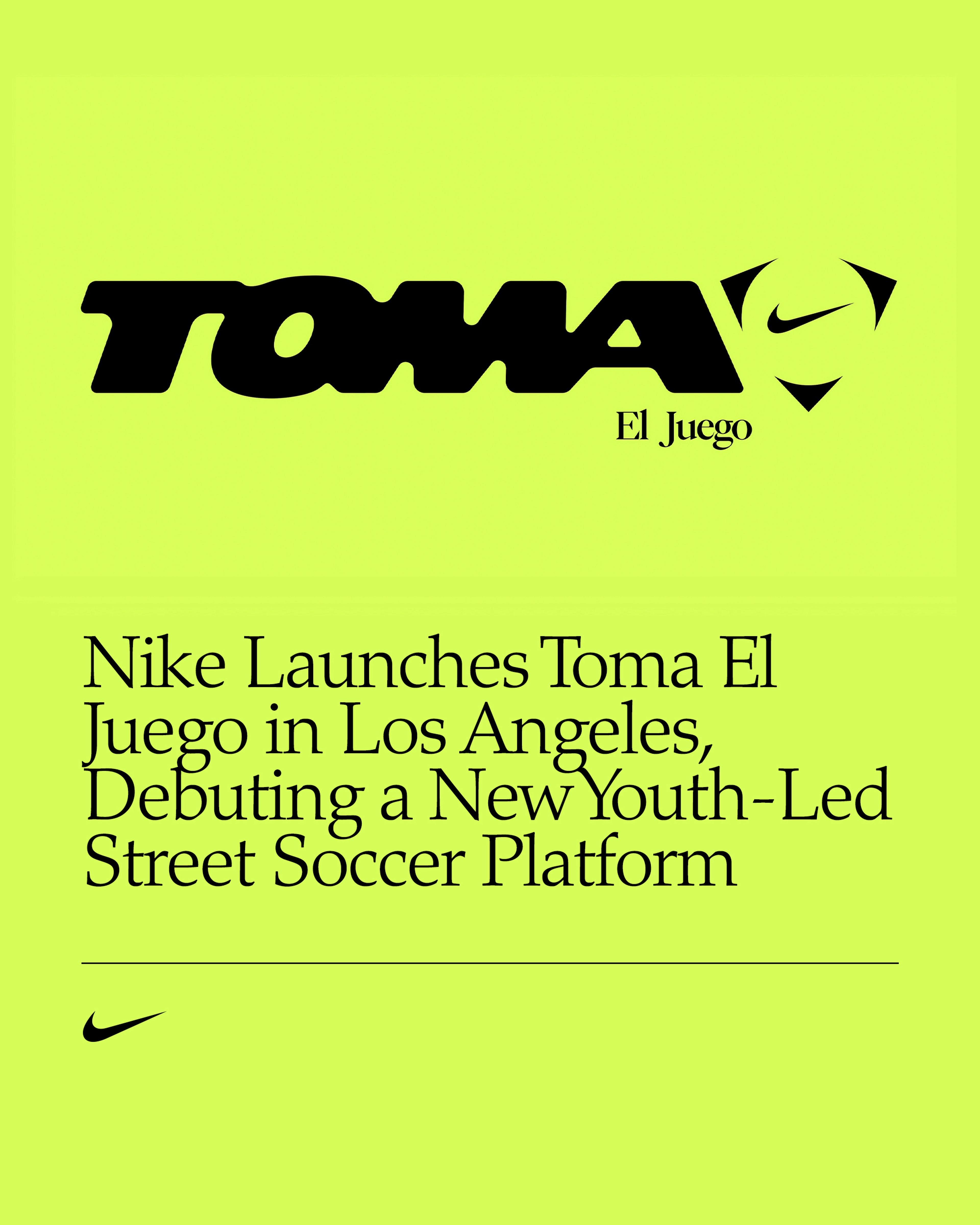 Nike lancia Toma El Juego, una piattaforma di street soccer dove i giovani sono i protagonisti, e pensata per dare sfogo alla gioia, alla libertà e all'espressione creativa del calcio tramite tornei di quartiere ed esperienze locali. L'obiettivo è avvicinare ancora di più atleti, atlete e fan a questo sport e alle loro comunità, creando allo stesso tempo una nuova generazione di leggende locali.