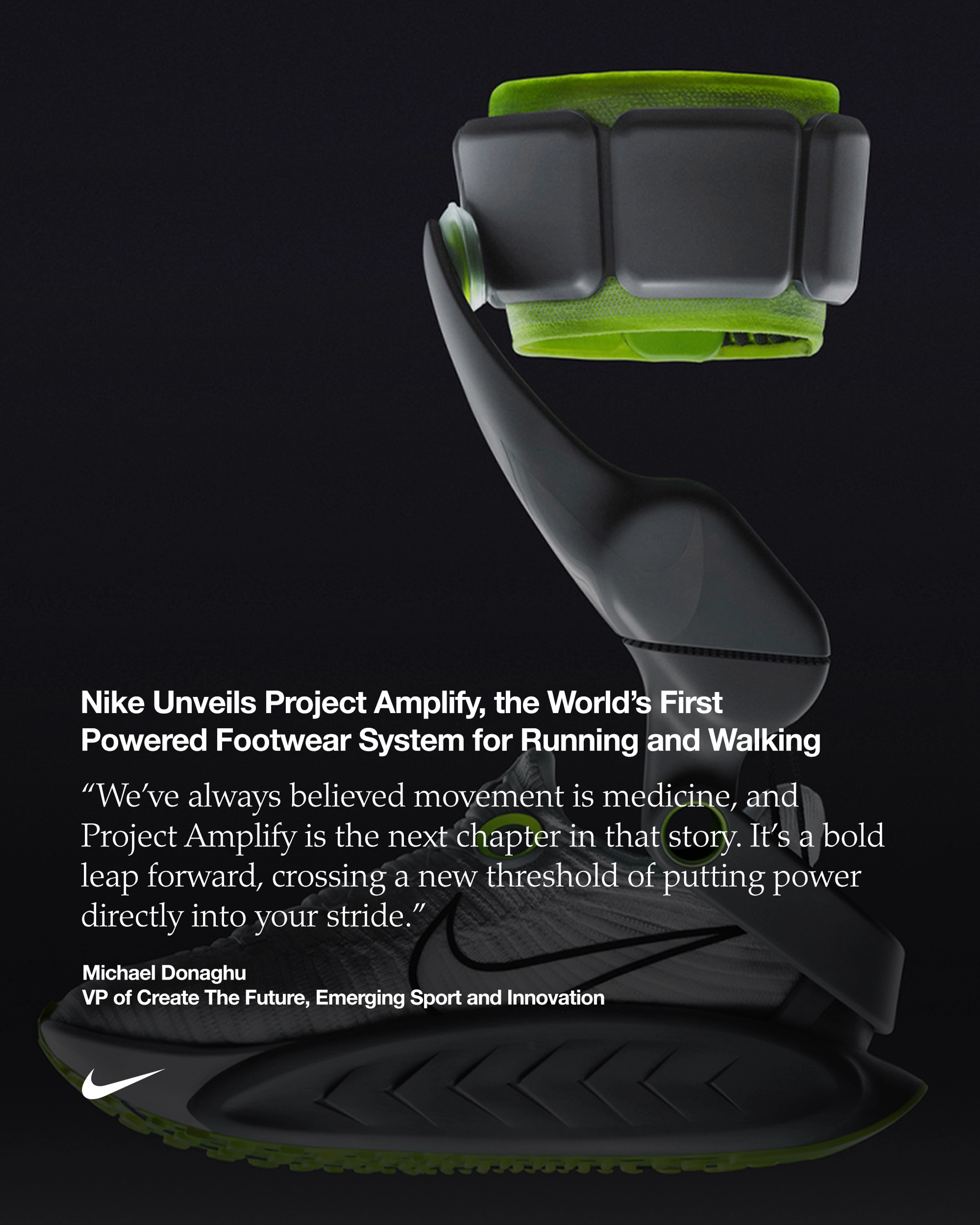 "Il nostro lavoro? È sognare in grande, mettendo in primo piano l'atleta", ha dichiarato Michael Donaghu, VP in Create The Future, Emerging Sport and Innovation. "Project Amplify è nato da una singola domanda: e se trovassimo un modo per aiutare l'atleta a muoversi più velocemente e su maggiori distanze con meno energia e più divertimento? In essenza, Project Amplify non fa che aggiungere un po' di potenza alla falcata, in modo naturale. Il divertimento nasce nel momento in cui ti rendi conto di poter fare più di quanto non credi, qualunque cosa significhi 'più' per te".