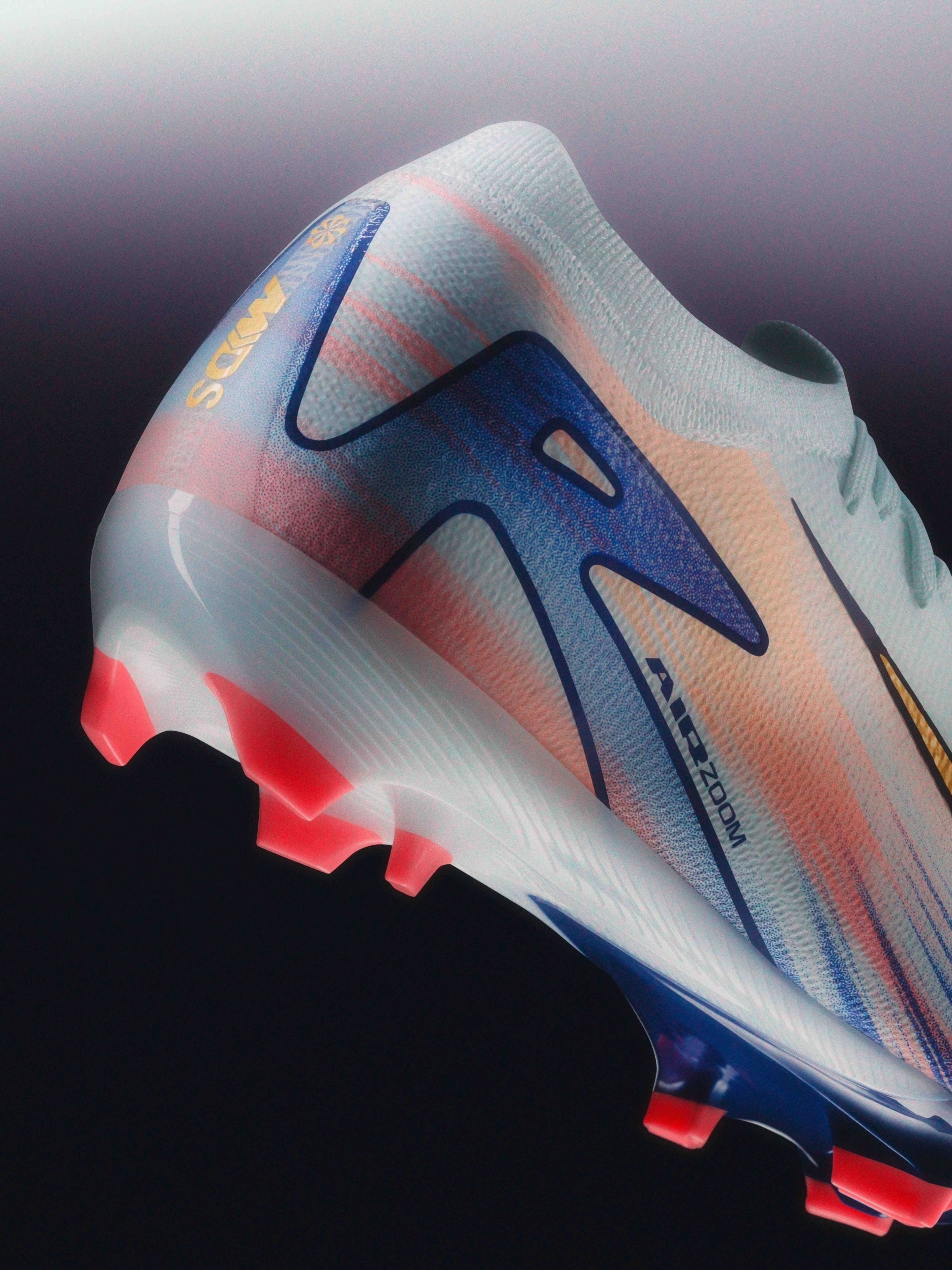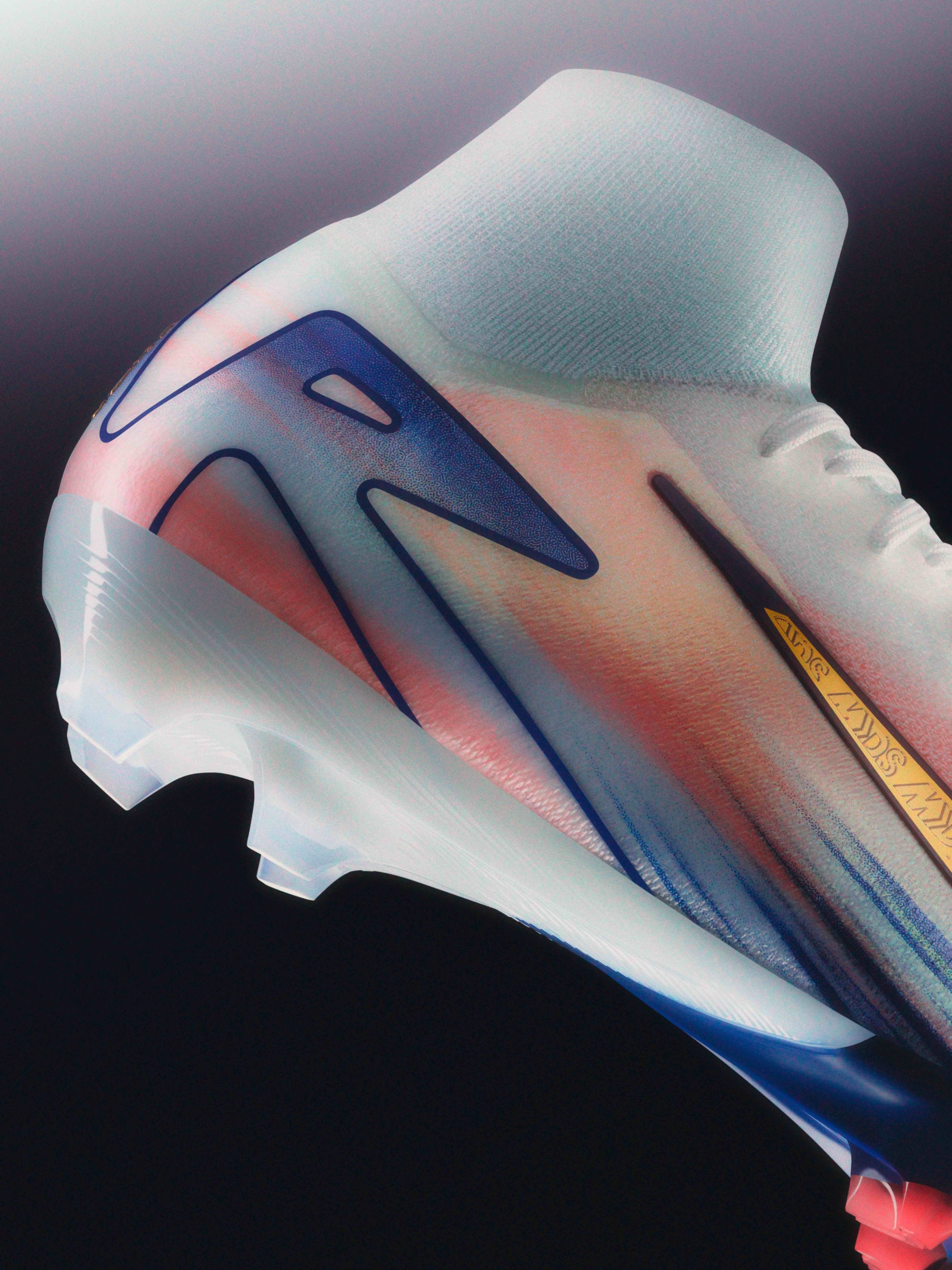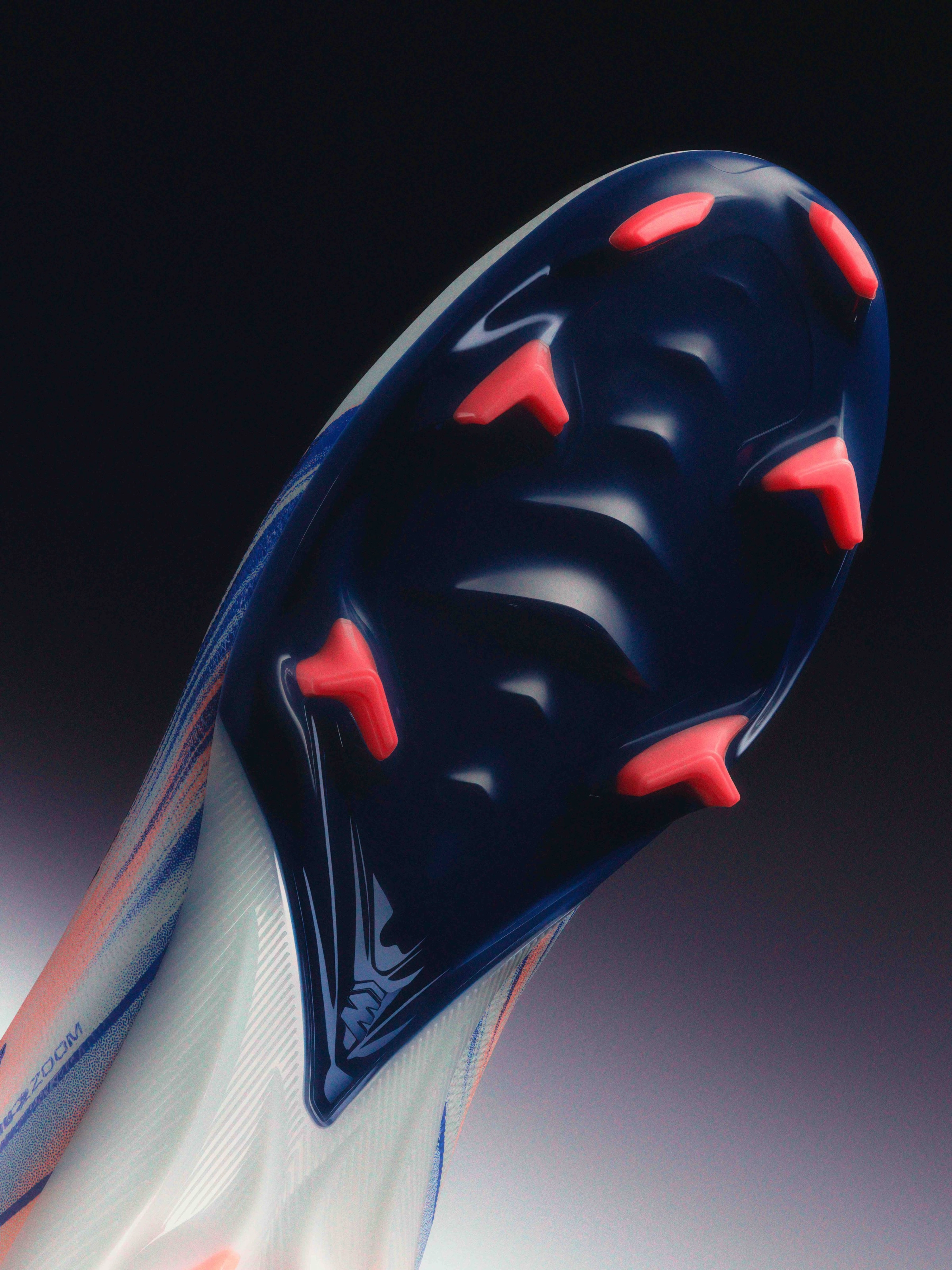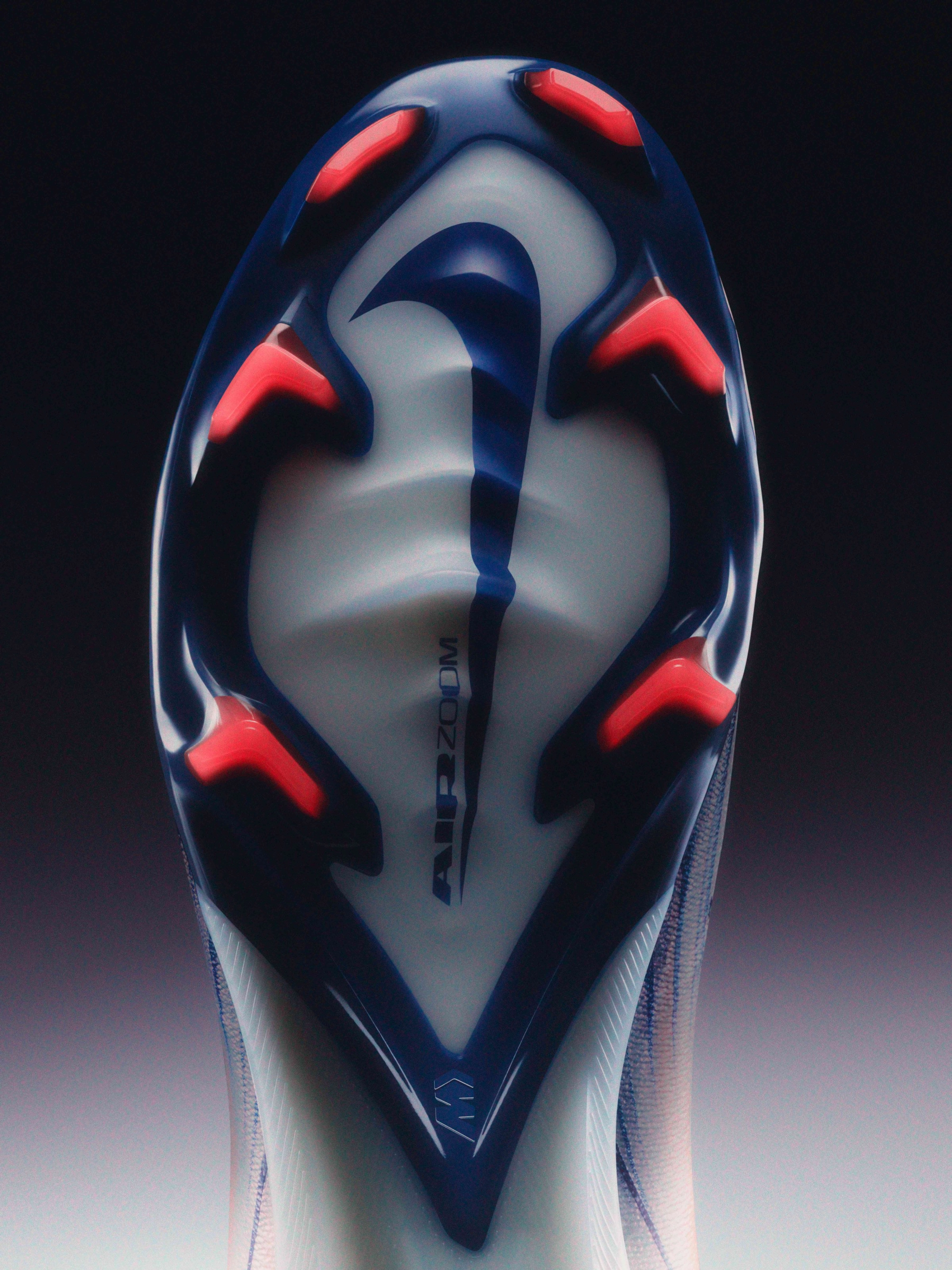 足裏に配したユニークな3/4丈のAir Zoomユニットが、キリアン・エムバペやサム・カーのような選手に弾むような加速を提供。いずれもマーキュリアルを履いて驚異的なスピードでプレーする選手たちです。 一方で一体型のスピードケージ構造がサッカー選手の足をしっかりと固定し、いつでも瞬時に加速できる準備を整えます。