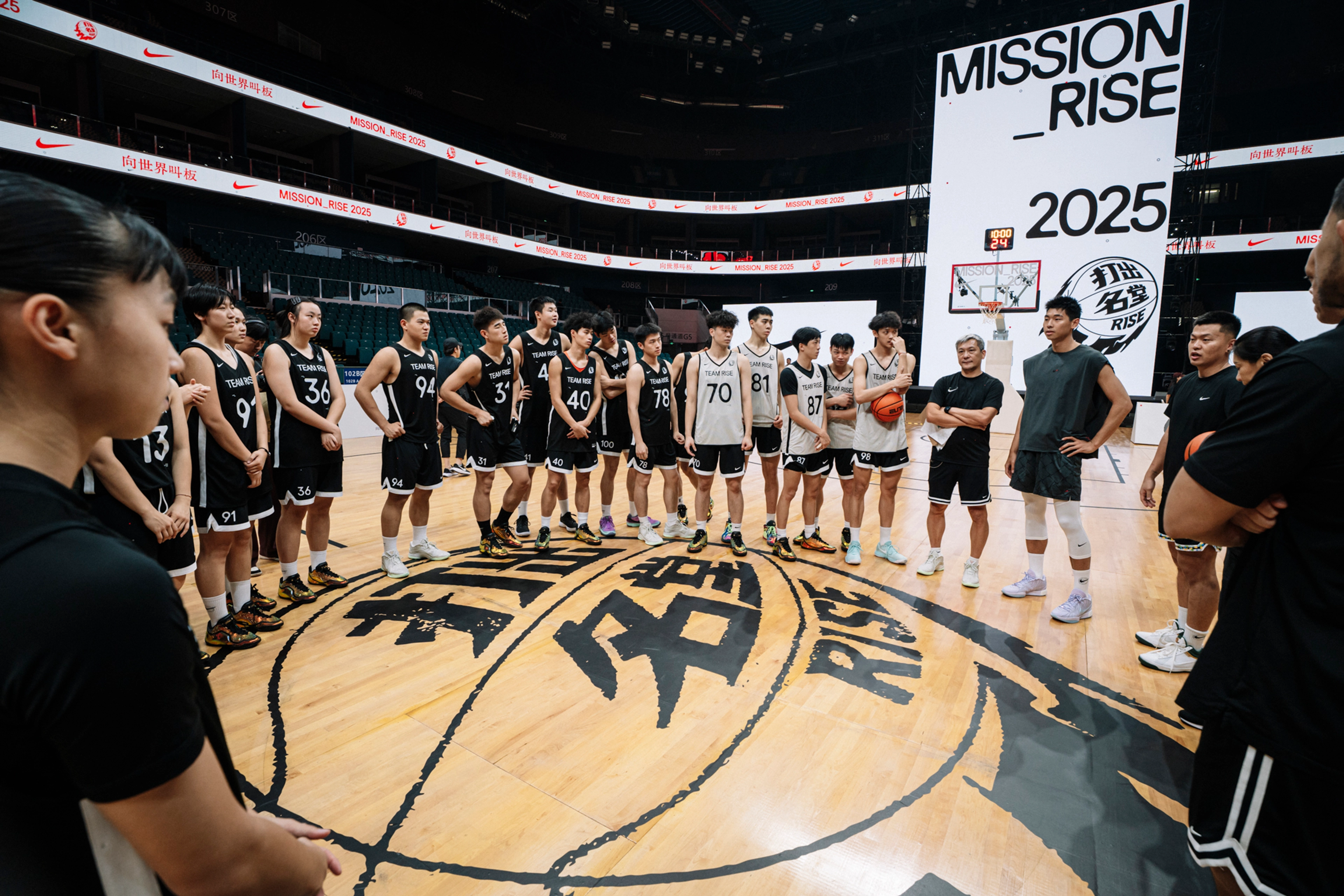 라이즈 남자팀과 여자팀이 웜업 세션에서 중국 남성 국가대표팀의 추이 융시의 말을 듣고 있는 모습입니다.