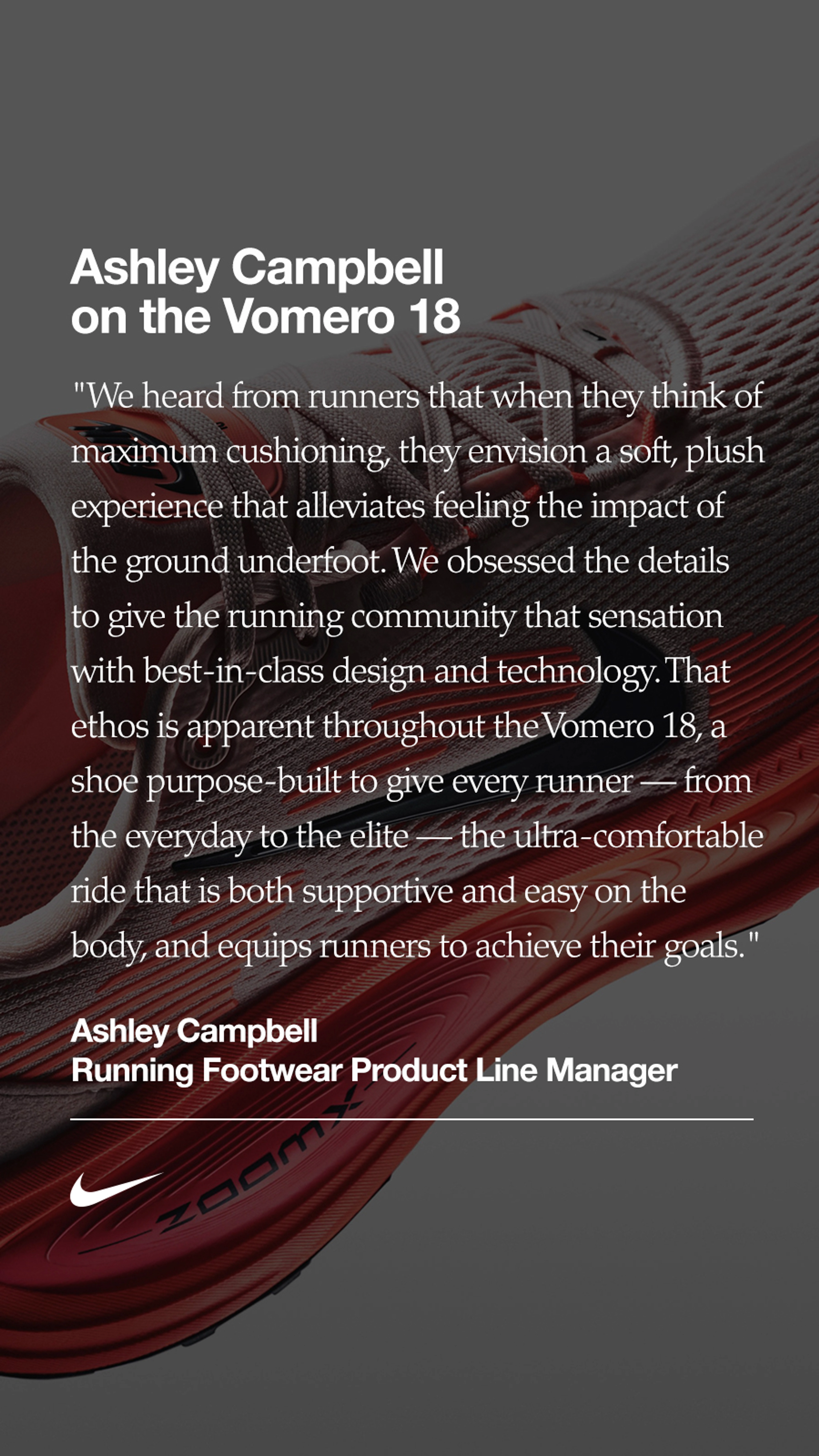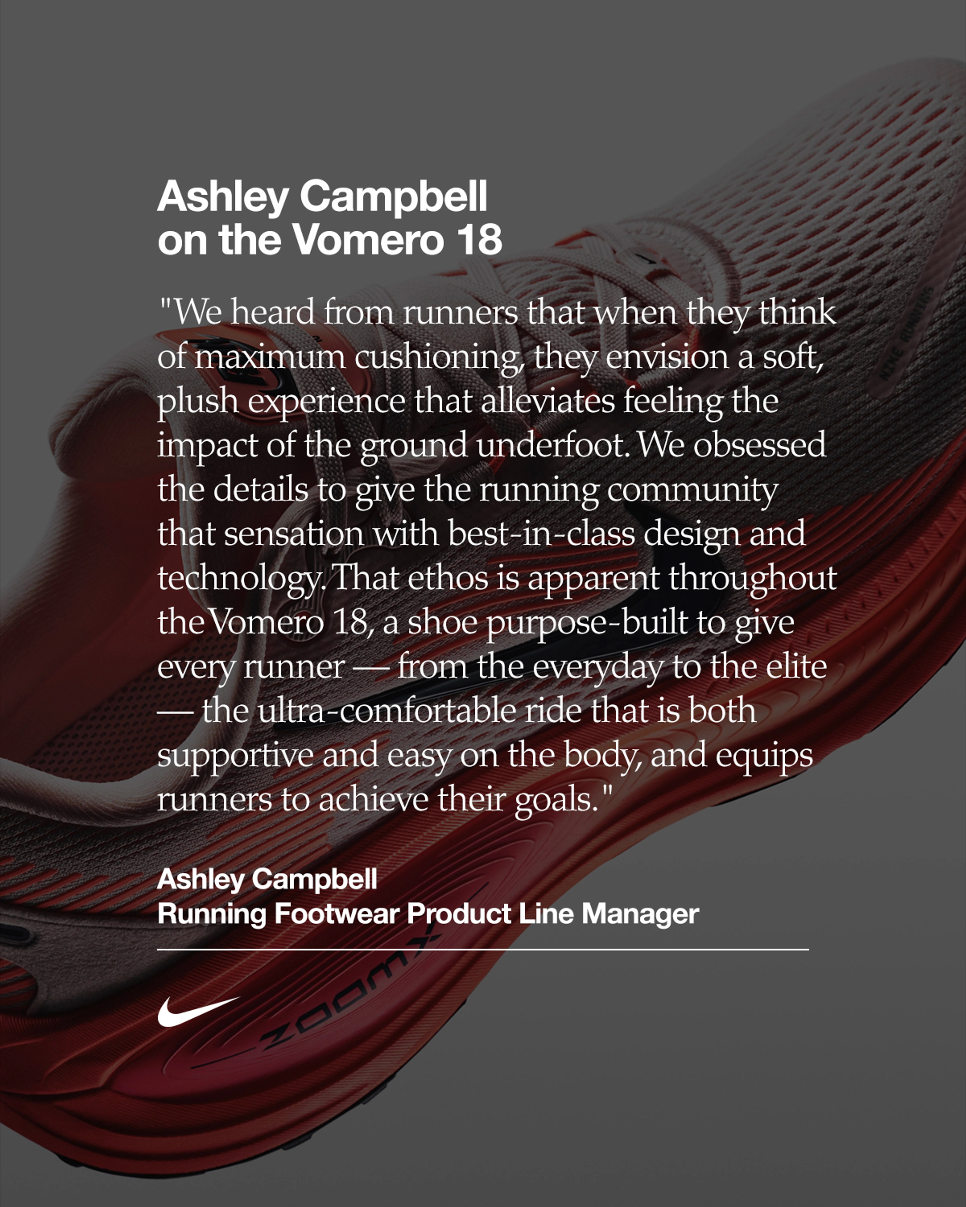 - Nike’s Vomero 18 introduces a new era of maximum cushioning for ultimate comfort, inviting athletes to run longer, go farther, push their limits and love every run.