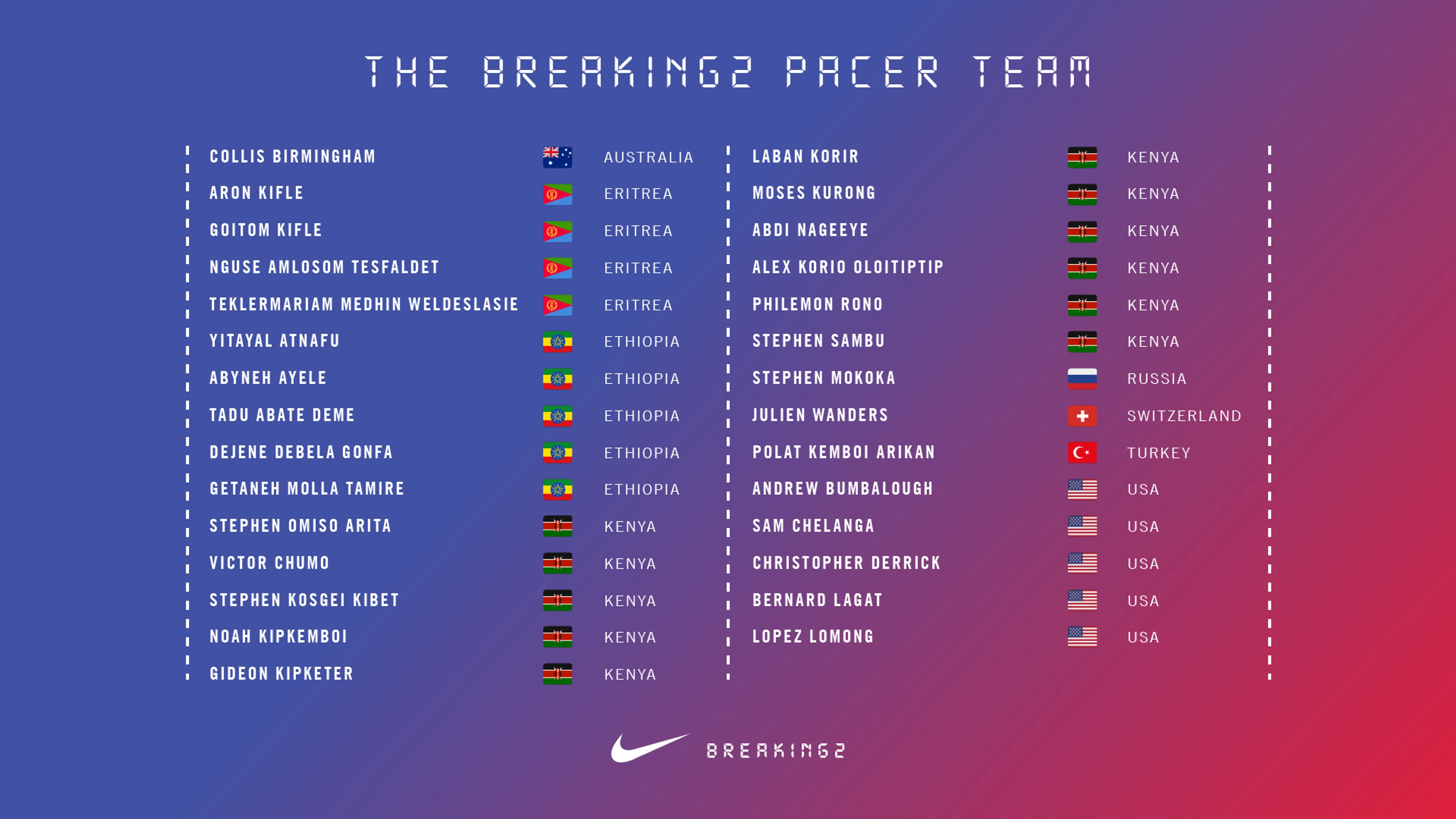 To break the two-hour barrier, the athletes can’t afford to go a second slower than they need to. That’s why a team of 30 pacers (made up of some of the world’s best distance runners, including Bernard Lagat) will aid the runners to a sub-two-hour race finish by running to help them maintain a steady race pace and by creating a wind divergence. Athletes were invited to join the pacer crew based on their running capabilities and temperament.