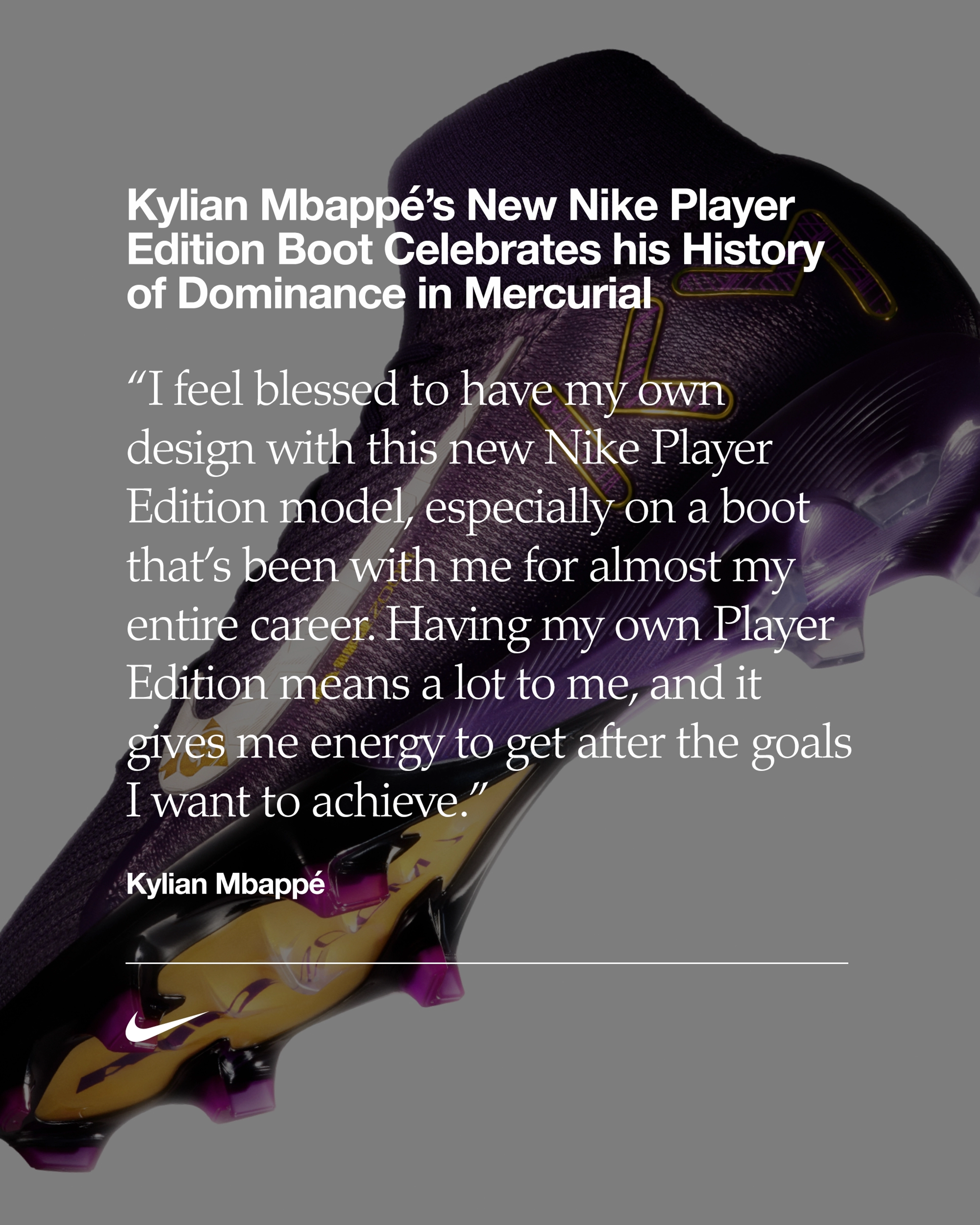 - Nike 即将推出基里安·姆巴佩全新球员版 Mercurial 足球鞋,助力基里安及其同时代的精英球员在赛场上展现速度、精湛技艺与出众表现。