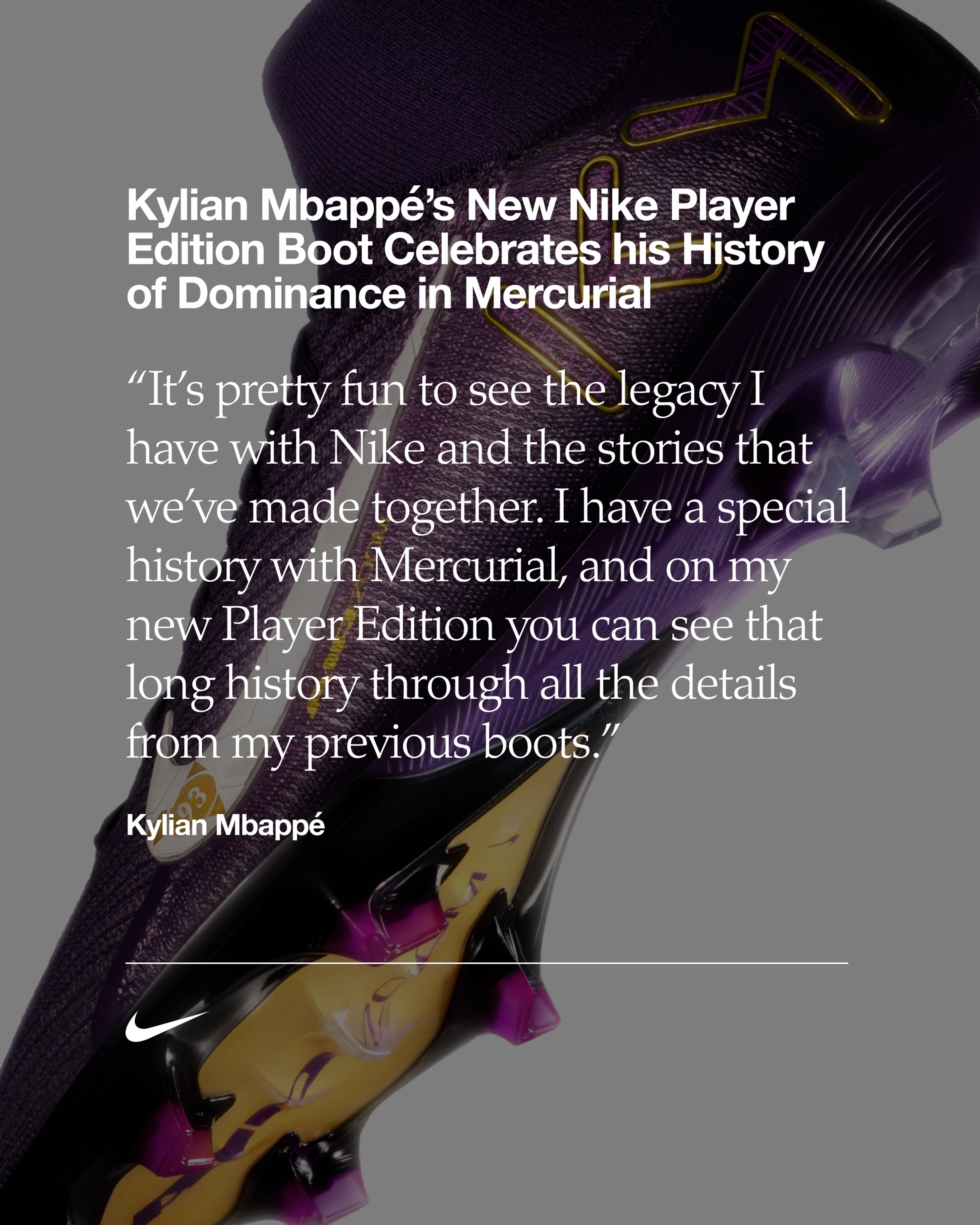 基里安称:“看到我与 Nike 共同书写的传奇以及携手创造的故事,我感到十分欣喜。 我与 Mercurial 系列球鞋有着不解之缘,在我的全新球员版球鞋上,你能通过此前各款球鞋的细节,感受到这段悠久的历史。”
