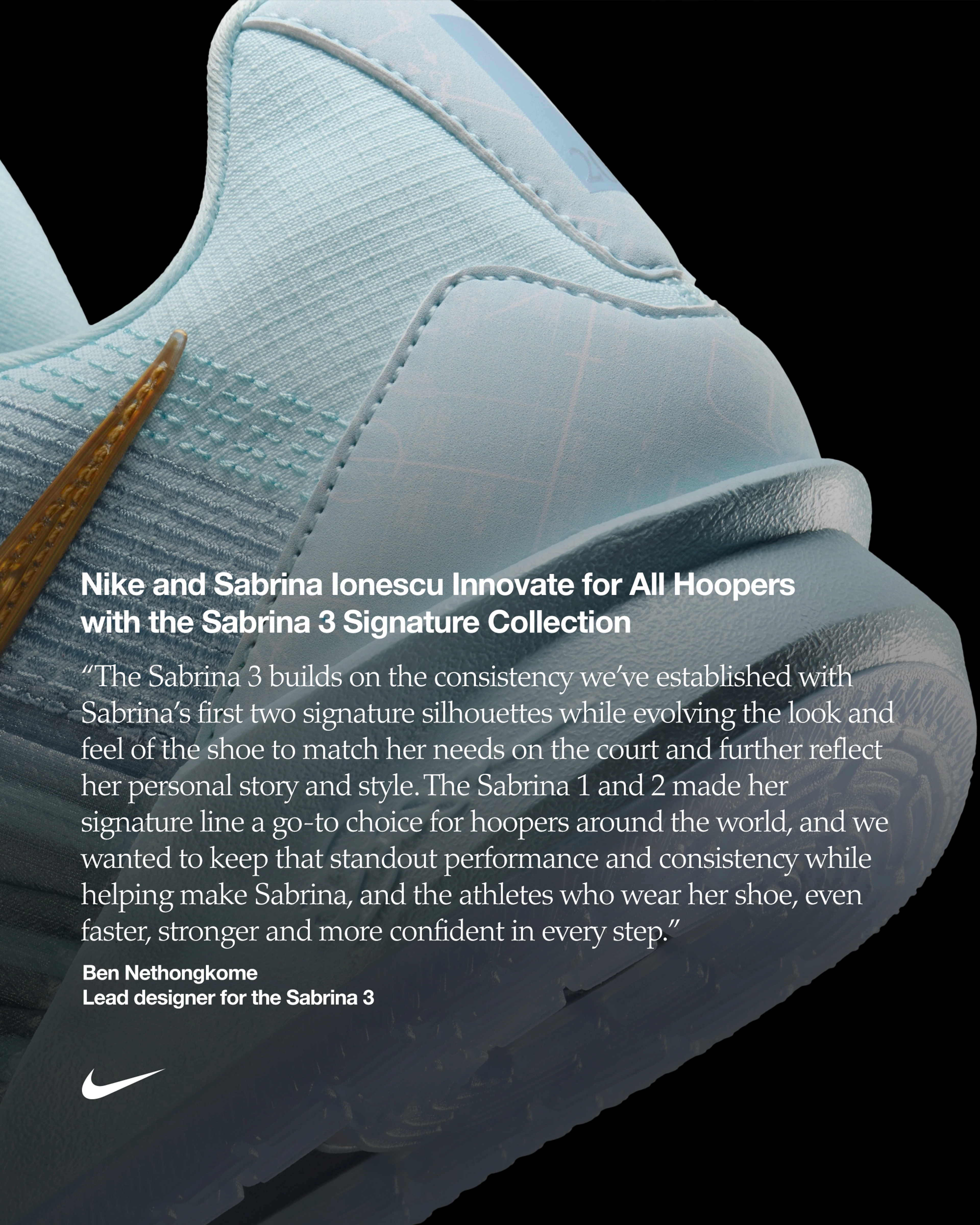 Nike Sabrina 鞋款首席设计师本·内通功 (Ben Nethongkome) 表示:“Sabrina 3 在延续前两代签名鞋稳定表现的基础上,进一步升级鞋款的外观设计与穿着体验,以满足萨布丽娜在球场上的需求,更深入地展现她的个人故事与风格。Sabrina 1 和 2 使她的签名系列在全球球员中备受青睐,我们希望在保持这份卓越表现与稳定性的同时,帮助萨布丽娜和穿着此签名鞋款的运动员,每一步都跑得更快、更强、更自信。”