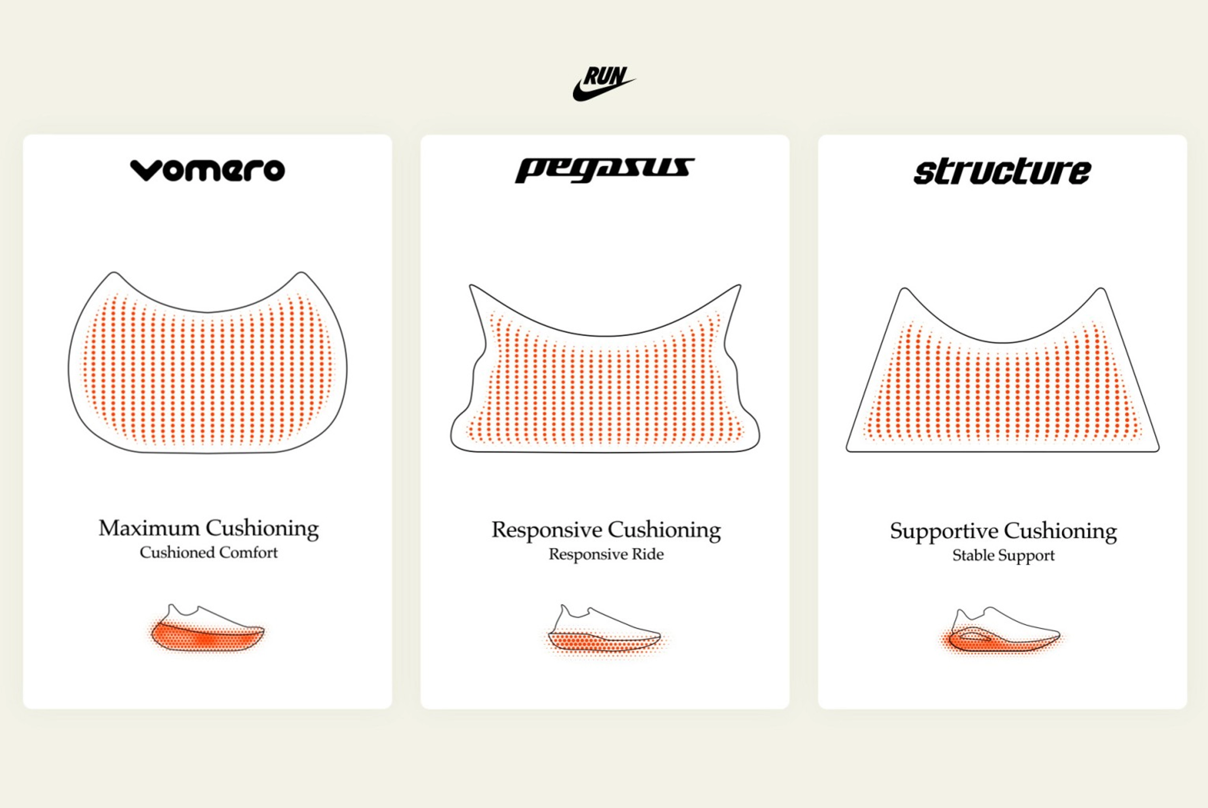 - 每個類別都有主要的優點。 Pegasus 是靈敏緩震,Structure 是支撐緩震,而 Vomero 是優異緩震。