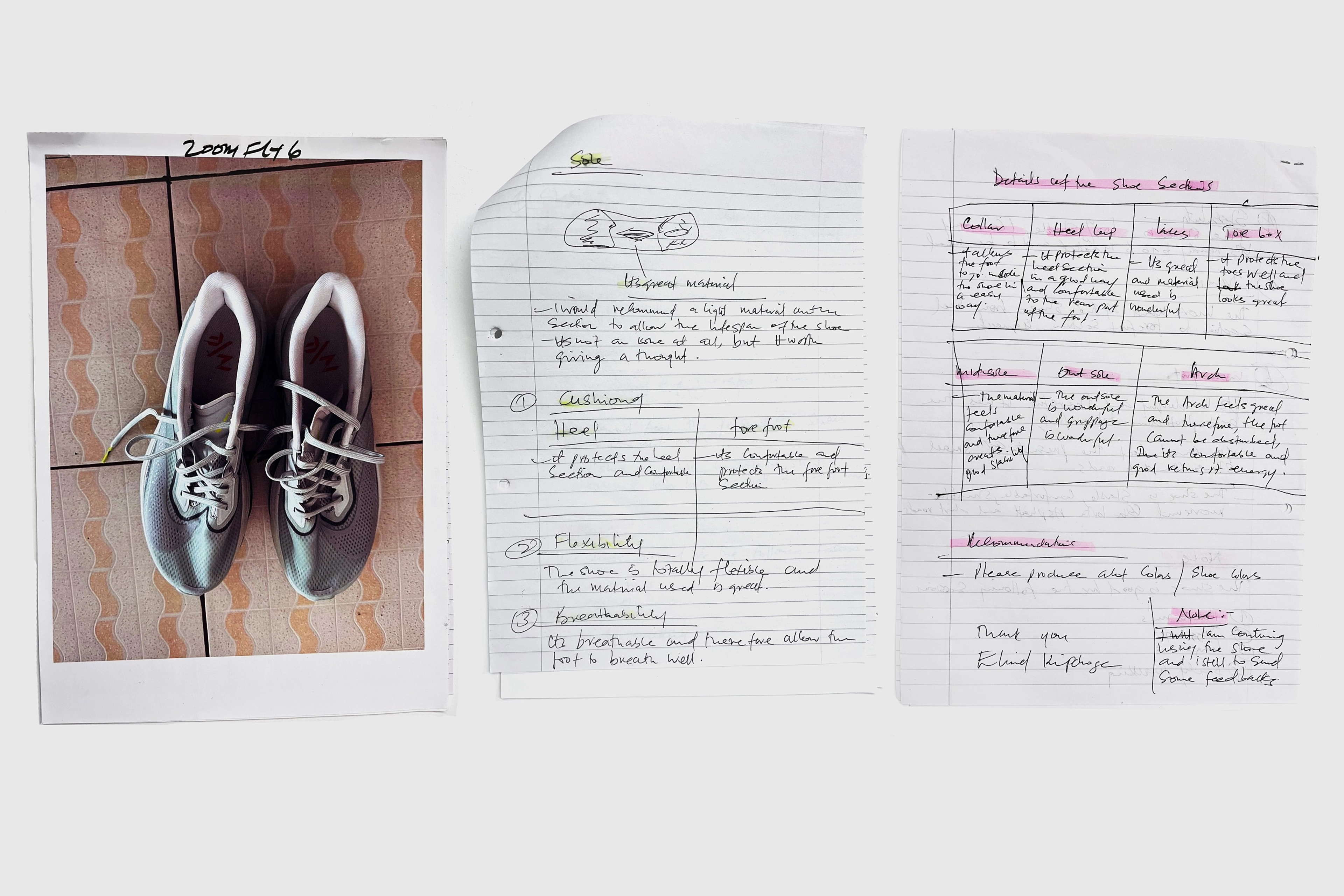 Eliud 過去已將 Zoom Fly 納入他的鞋款選擇中,尤其是 Zoom Fly 5,這是他週一輕鬆跑的理想訓練鞋;他會走出戶外,不限地點地跑個 12 到 18 英哩。 在測試 Nike Zoom Fly 6 時,他立即注意到重量更輕且鞋面更舒適,他輕聲細語且有條不紊地向 Heath 傳達了這兩點。 他也樂於提供建設性的意見回饋,但總是很客氣,例如他建議在外底添加再略為耐用的材質,有助讓鞋款更經得起嚴苛的訓練計畫。 他在筆記中潦草地寫下:「這值得考慮。」